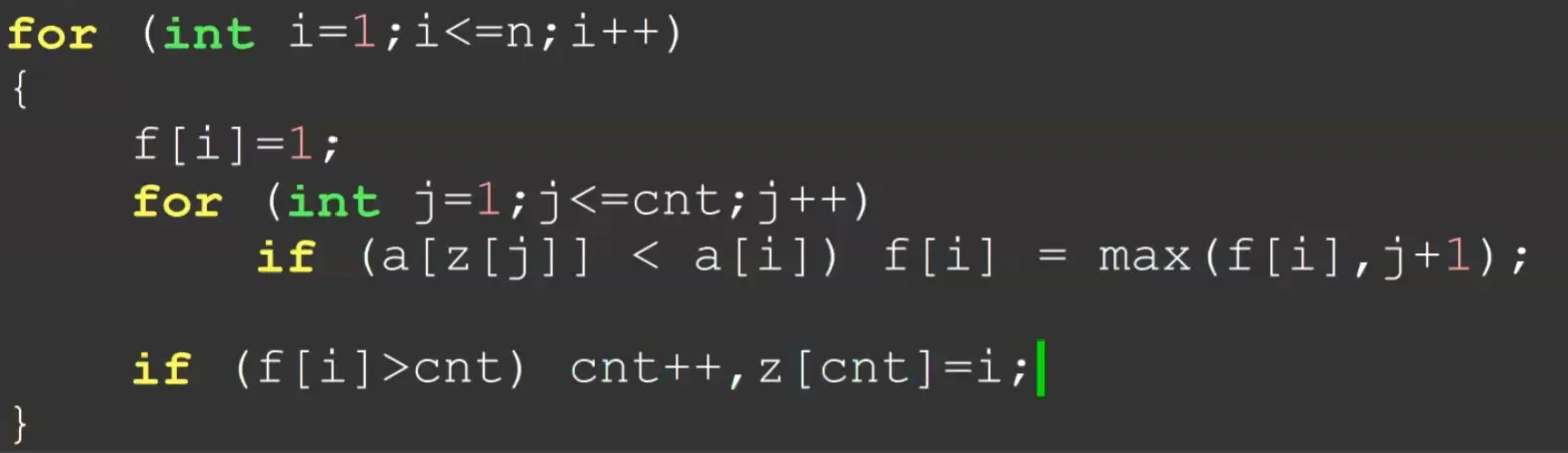 最长上升子序列(Longest Increasing Subsequence) 1.求最长长度f [ i ] f[i] f [ i ] 代表 i i i 必选且 i i i 为最后一个数得到的最长上升子序列。